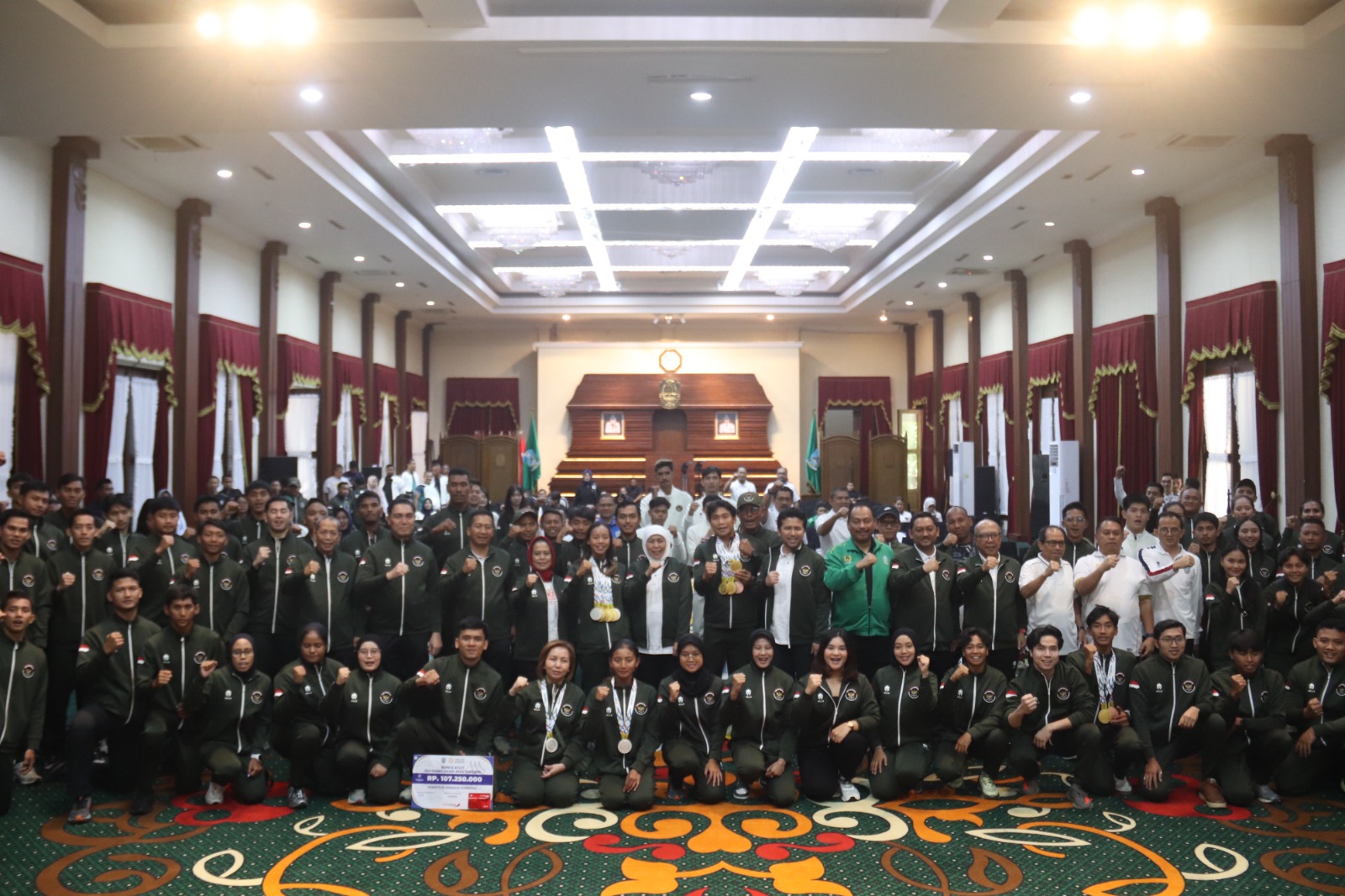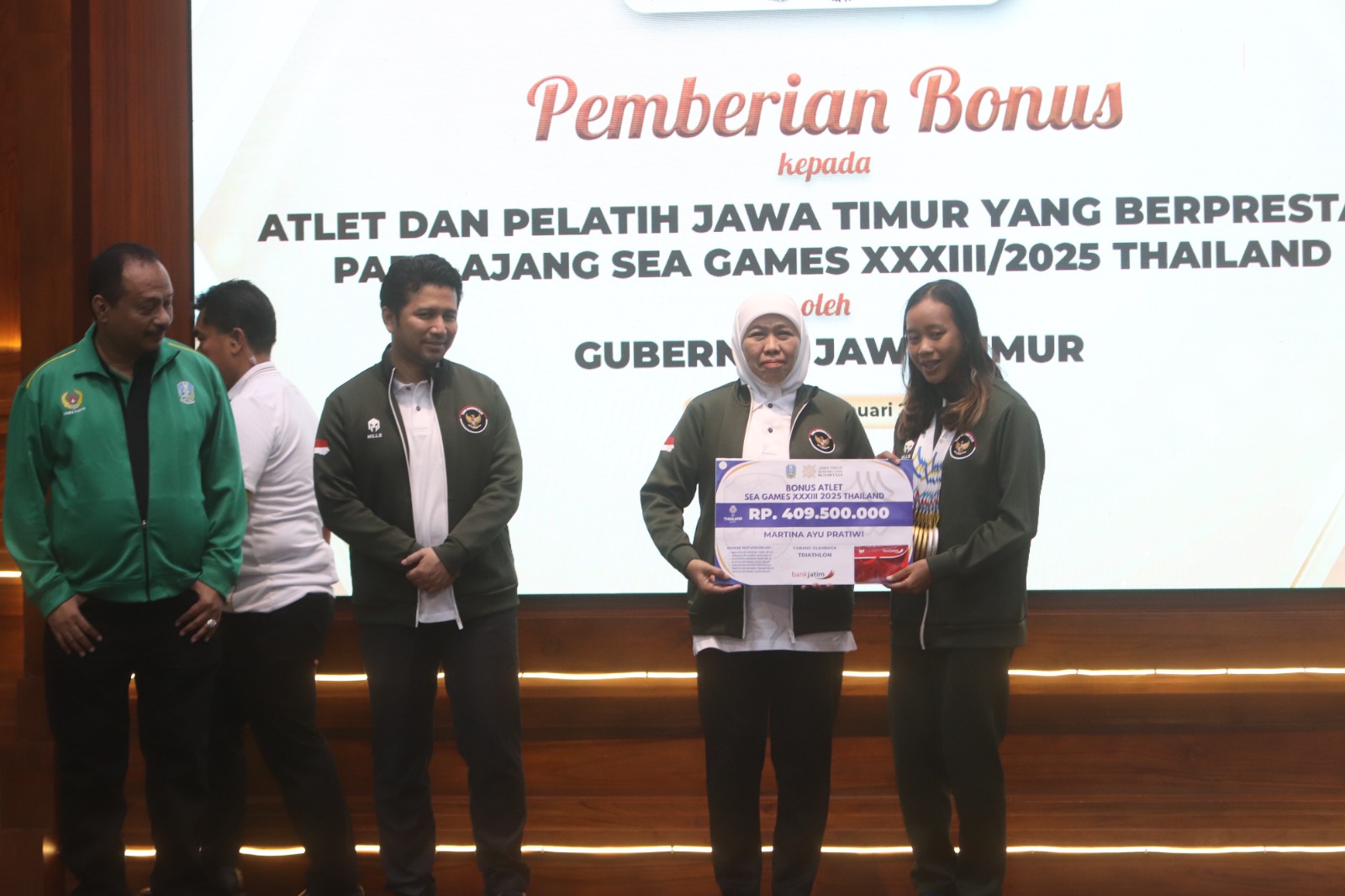 Gubernur Jawa Timur Khofifah Indar Parawansa menyerahkan bonus bernilai puluhan juta rupiah kepada atlet dan pelatih yang sukses menyumbangkan medali bagi Indonesia. Penyerahan bonus tersebut berlangsung di Gedung Negara Grahadi, Surabaya, Jumat (30/1/2026).
